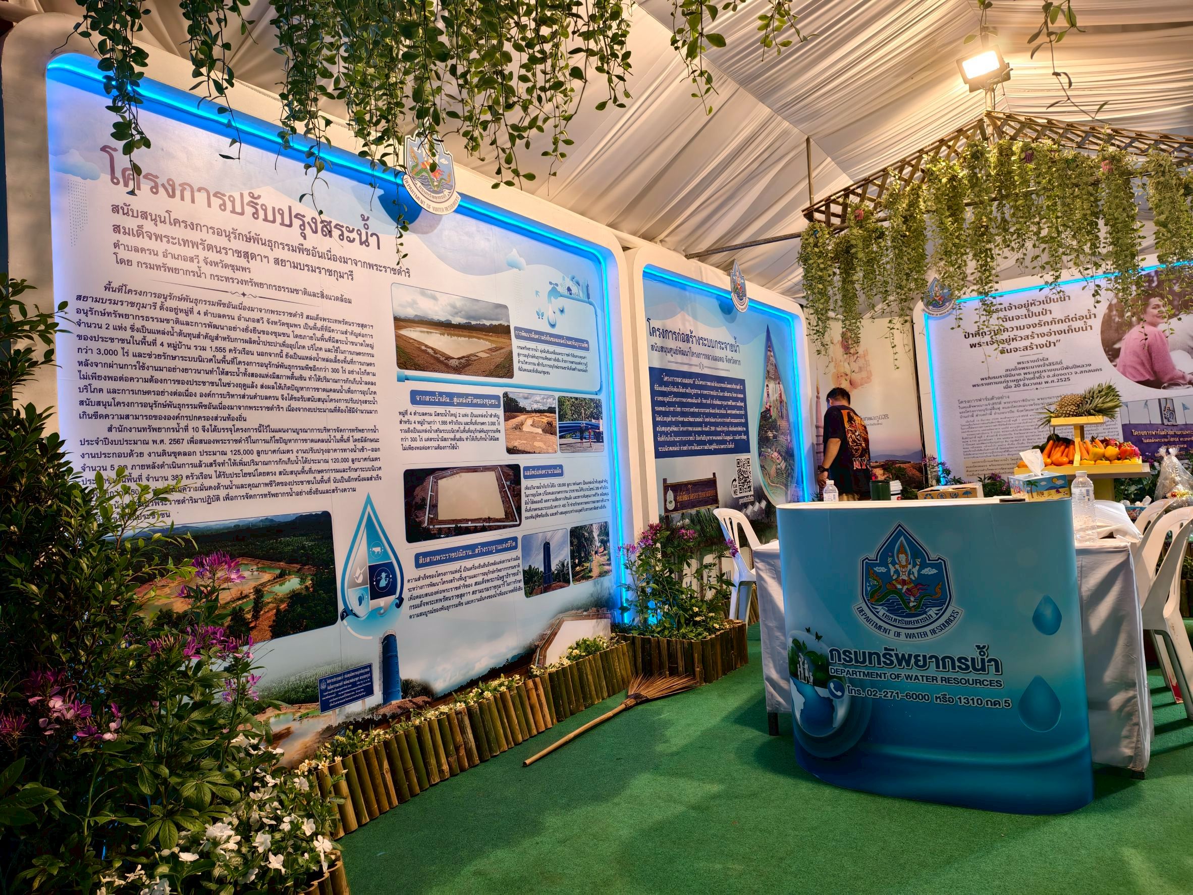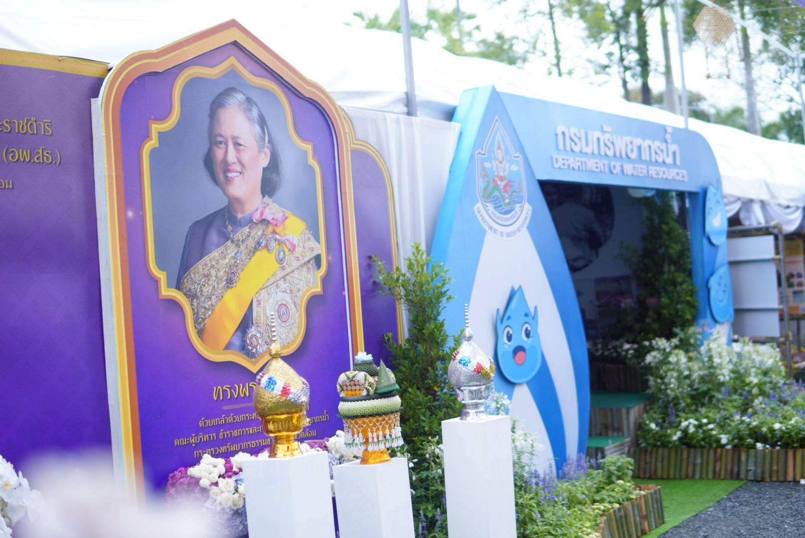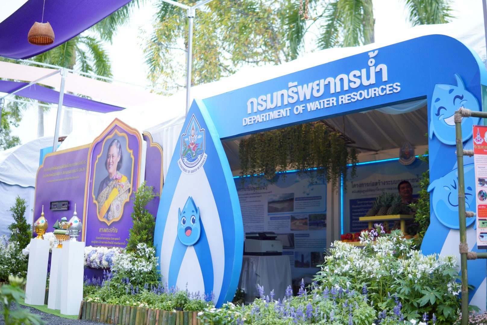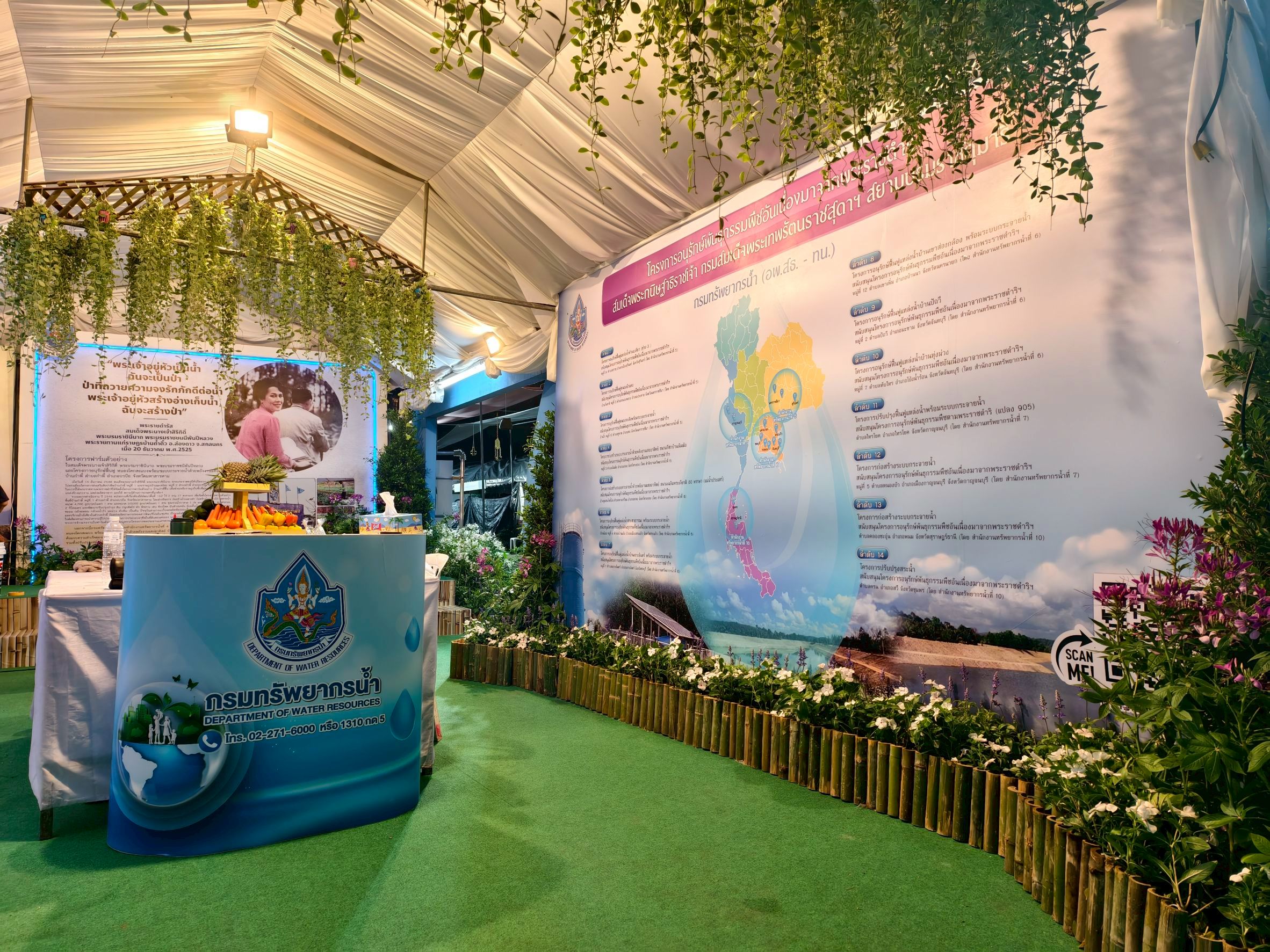 ขอเชิญชวนทุกท่านร่วมชมนิทรรศการของกรมทรัพยากรน้ำ ได้ที่โซน OA19 สนามวังซ้าย ภายในพื้นที่นิทรรศการหน่วยงานสนองพระราชดำริ อาทิ โครงการฟาร์มตัวอย่างในสมเด็จพระนางเจ้าสิริกิติ์ พระบรมราชินีนาถ พระบรมราชชนนีพันปีหลวง และโครงการอนุรักษ์ฟื้นฟูหนองโคกสะแบงพร้อมระบบกระจายน้ำ ด้วยพลังงานแสงอาทิตย์ บ้านกำพี้ ตำบลกำพี้ อำเภอบรบือ จังหวัดมหาสารคาม "พระเจ้าอยู่หัวเป็นน้ำ ฉันจะเป็นป่า ป่าที่ ถวายความจงรักภักดีต่อน้ำ พระเจ้าอยู่หัวสร้างอ่างเก็บน้ำ ฉันจะสร้างป่า" นิทรรศการโครงการก่อสร้างระบบกระจายน้ำ สนับสนุนศูนย์พัฒนาโครงการหลวงเลอตอ จังหวัดตาก นิทรรศการโครงการปรับปรุงสระน้ำ สนับสนุนโครงการอนุรักษ์พันธุกรรมพืชอันเนื่องมาจากพระราชดำริ
