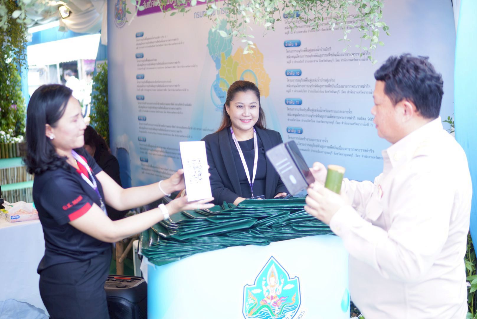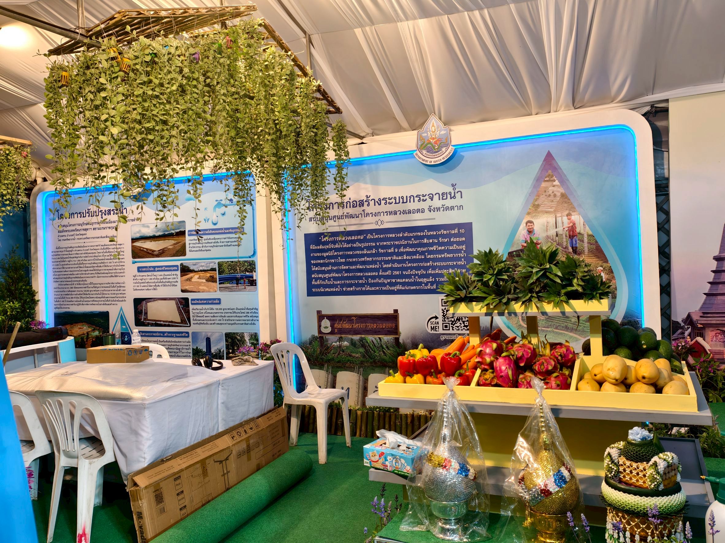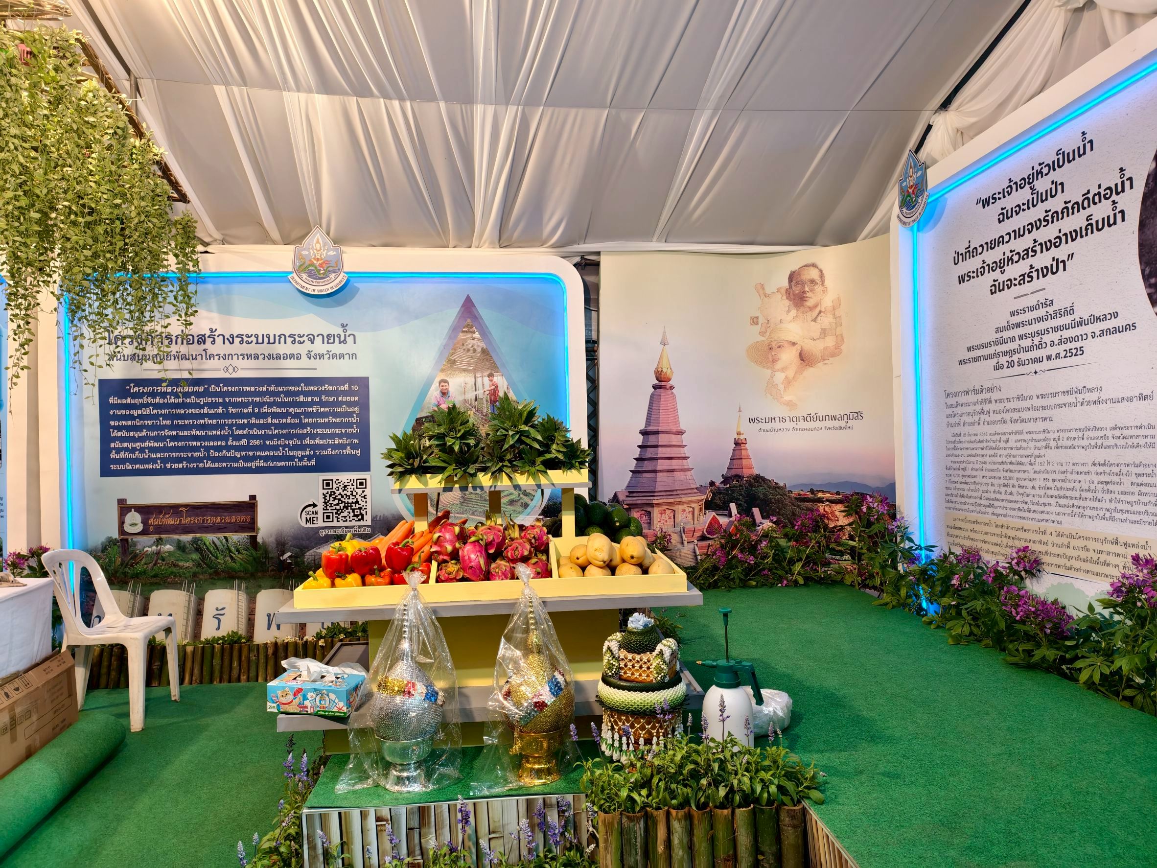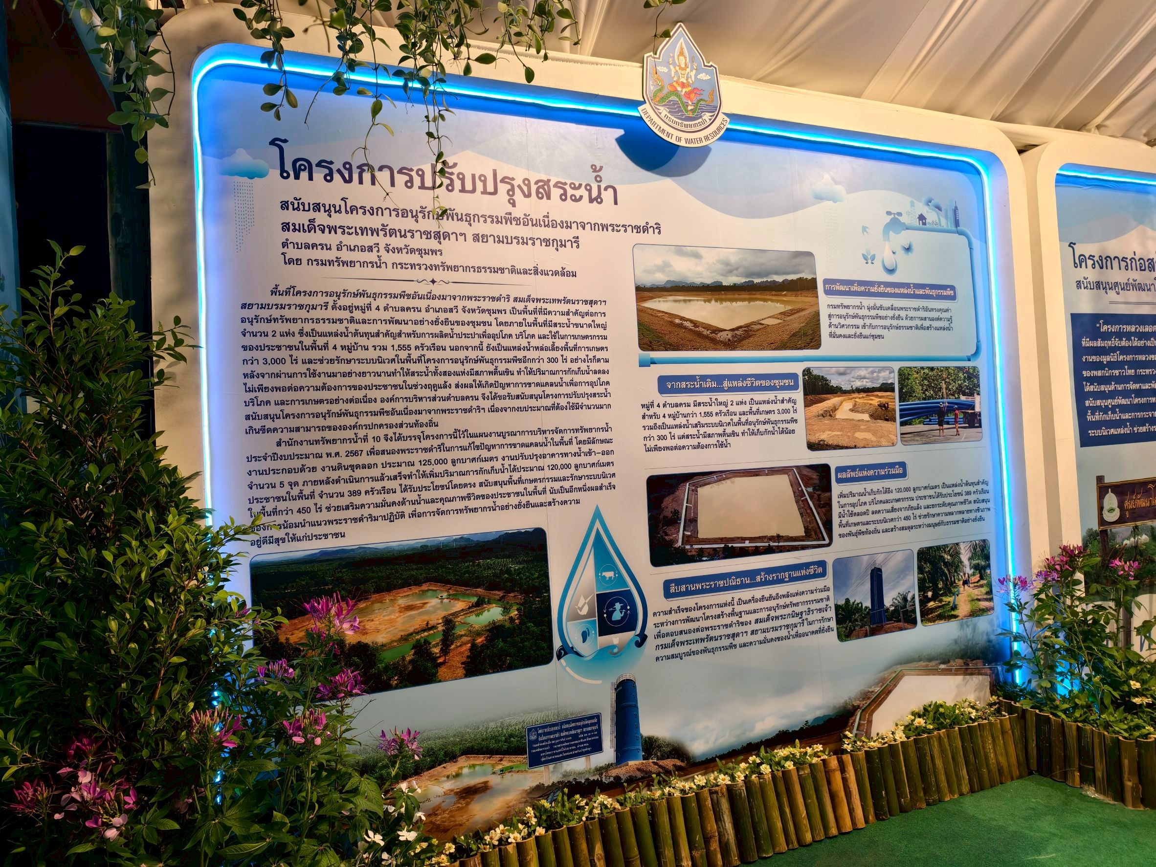 ขอเชิญชวนทุกท่านร่วมชมนิทรรศการของกรมทรัพยากรน้ำ ได้ที่โซน OA19 สนามวังซ้าย ภายในพื้นที่นิทรรศการหน่วยงานสนองพระราชดำริ อาทิ โครงการฟาร์มตัวอย่างในสมเด็จพระนางเจ้าสิริกิติ์ พระบรมราชินีนาถ พระบรมราชชนนีพันปีหลวง และโครงการอนุรักษ์ฟื้นฟูหนองโคกสะแบงพร้อมระบบกระจายน้ำ ด้วยพลังงานแสงอาทิตย์ บ้านกำพี้ ตำบลกำพี้ อำเภอบรบือ จังหวัดมหาสารคาม "พระเจ้าอยู่หัวเป็นน้ำ ฉันจะเป็นป่า ป่าที่ ถวายความจงรักภักดีต่อน้ำ พระเจ้าอยู่หัวสร้างอ่างเก็บน้ำ ฉันจะสร้างป่า" นิทรรศการโครงการก่อสร้างระบบกระจายน้ำ สนับสนุนศูนย์พัฒนาโครงการหลวงเลอตอ จังหวัดตาก นิทรรศการโครงการปรับปรุงสระน้ำ สนับสนุนโครงการอนุรักษ์พันธุกรรมพืชอันเนื่องมาจากพระราชดำริ
